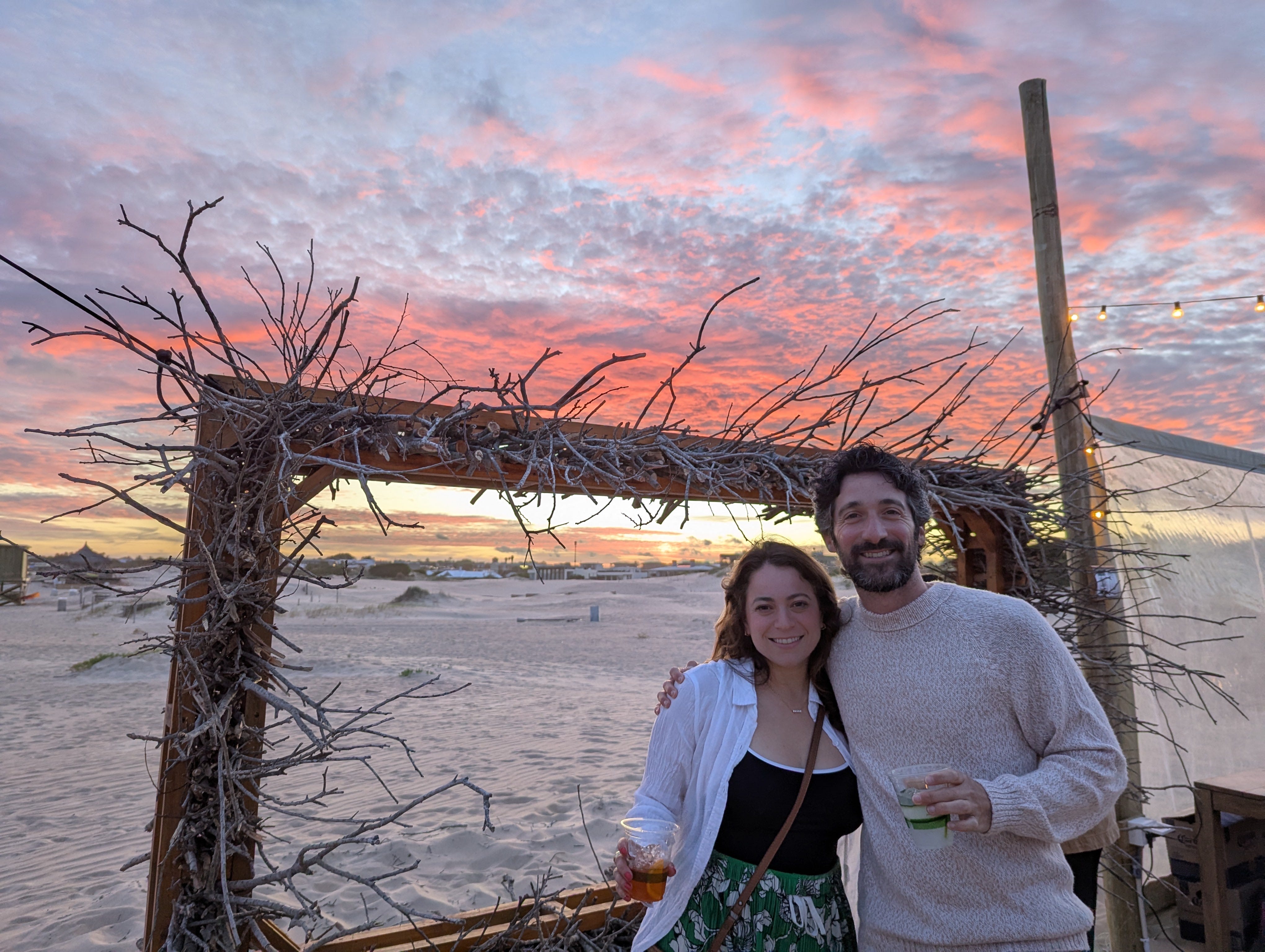 The sun coming down over the grassy dunes and bougie bungalow homes of the booming neighborhood just off the beach. Shane and JULIE (35, a short social butterfly from New York visiting Shane on his travels) walk along the dirty, sandy road, approaching the beach they still cannot see.