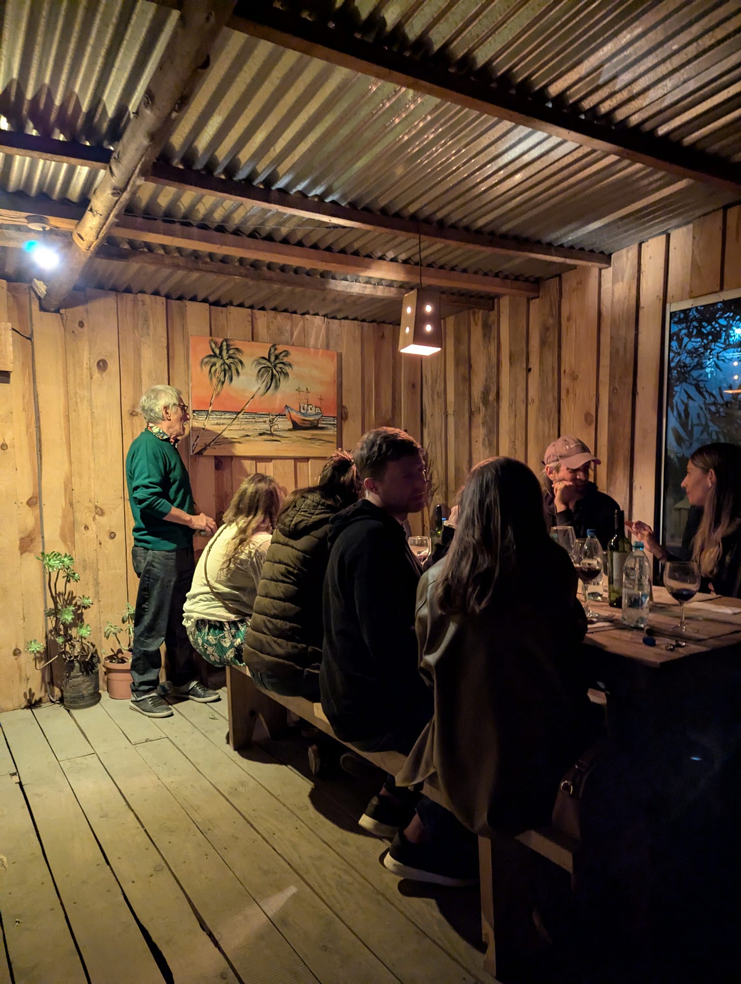 Shane and Julie are spread among a large table of friends eating, sharing wine and cigarettes. A fire pit crackles in corner.