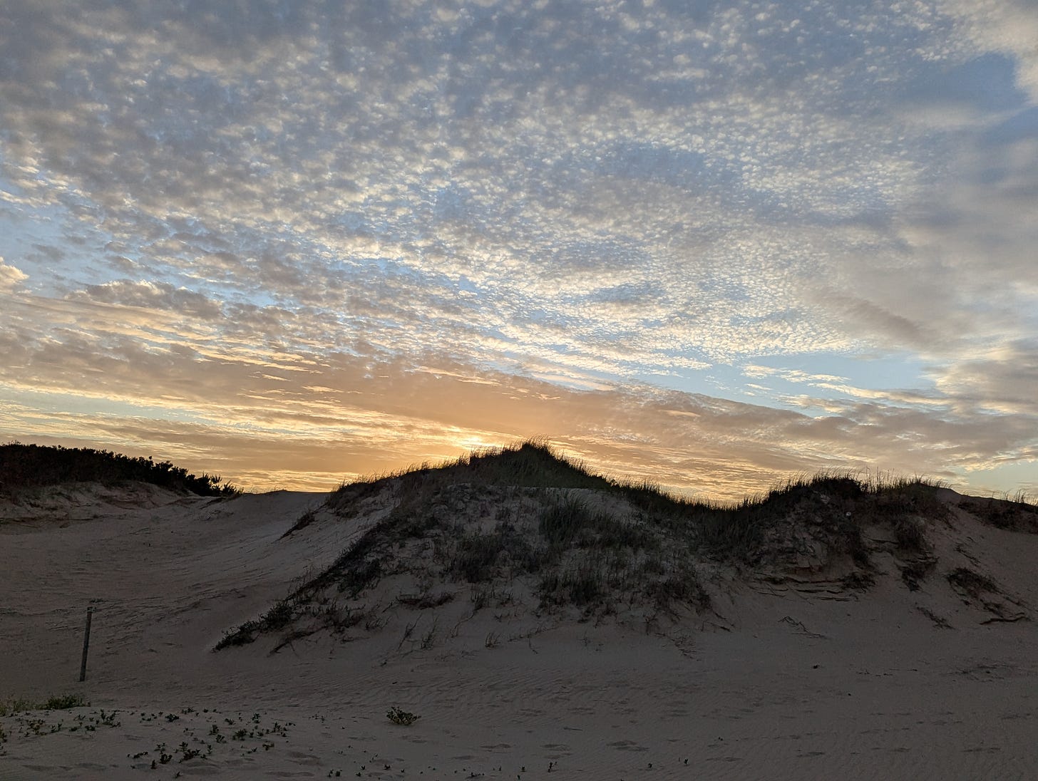 They walk up a wooden ramp, leading over a sand dune and onto: