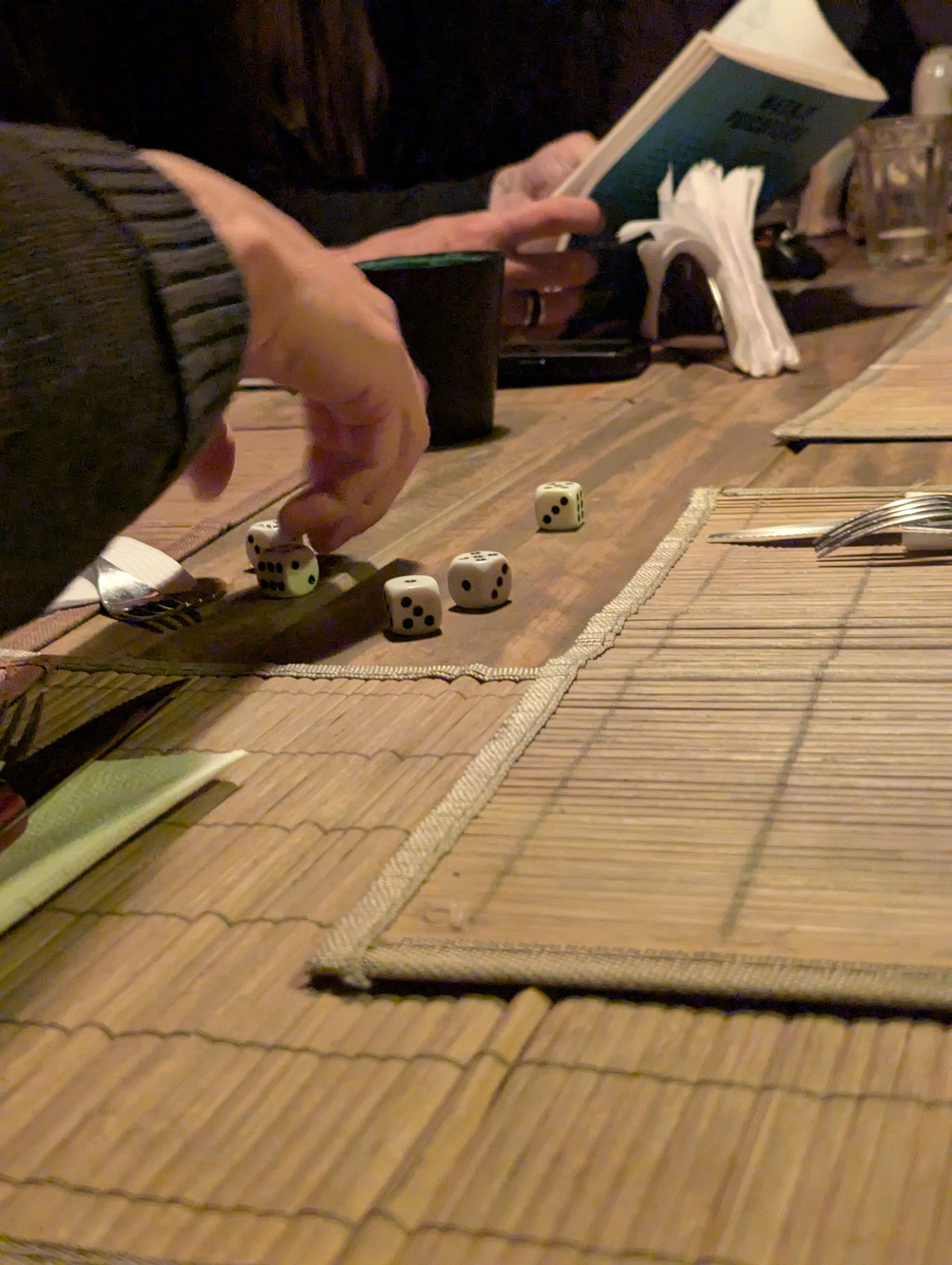 JOHN: Okay so this is twenty. See I have a five? But I have fours. Then it’s still my turn. So I roll… Okay so that’s ten again. The two’s. Plus a one. The one doesn’t count. Then again… twenty. So I’m at sixty. Got it? And I roll again…