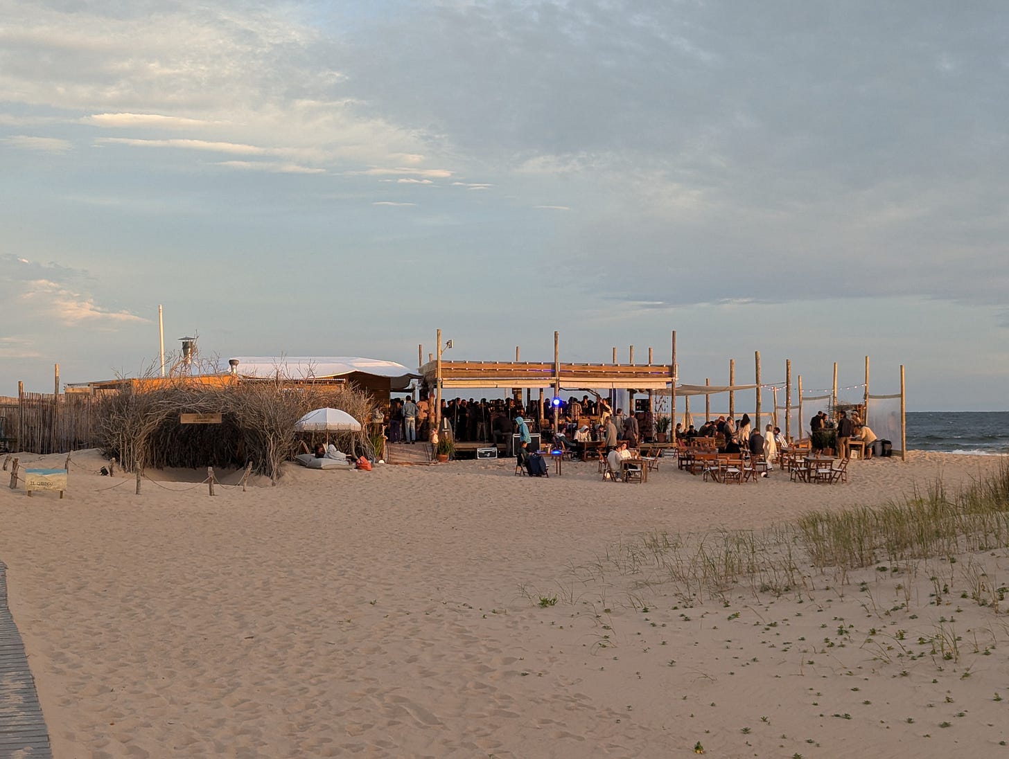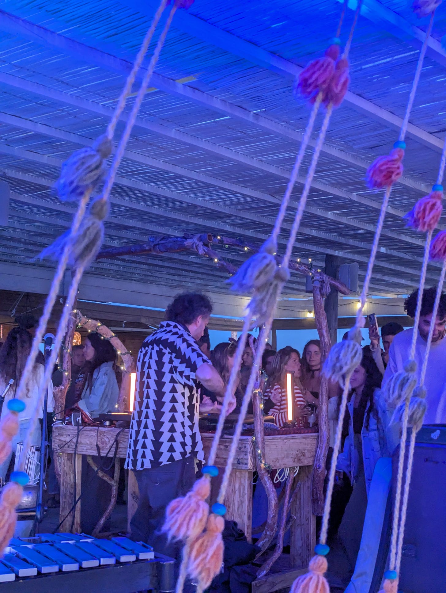 An open aired restaurant pulses with light and vibration in the distance. The dance floor is full of artsy, hip, unique, “Burning-Man” type attendees ranging in ages from 19-69.